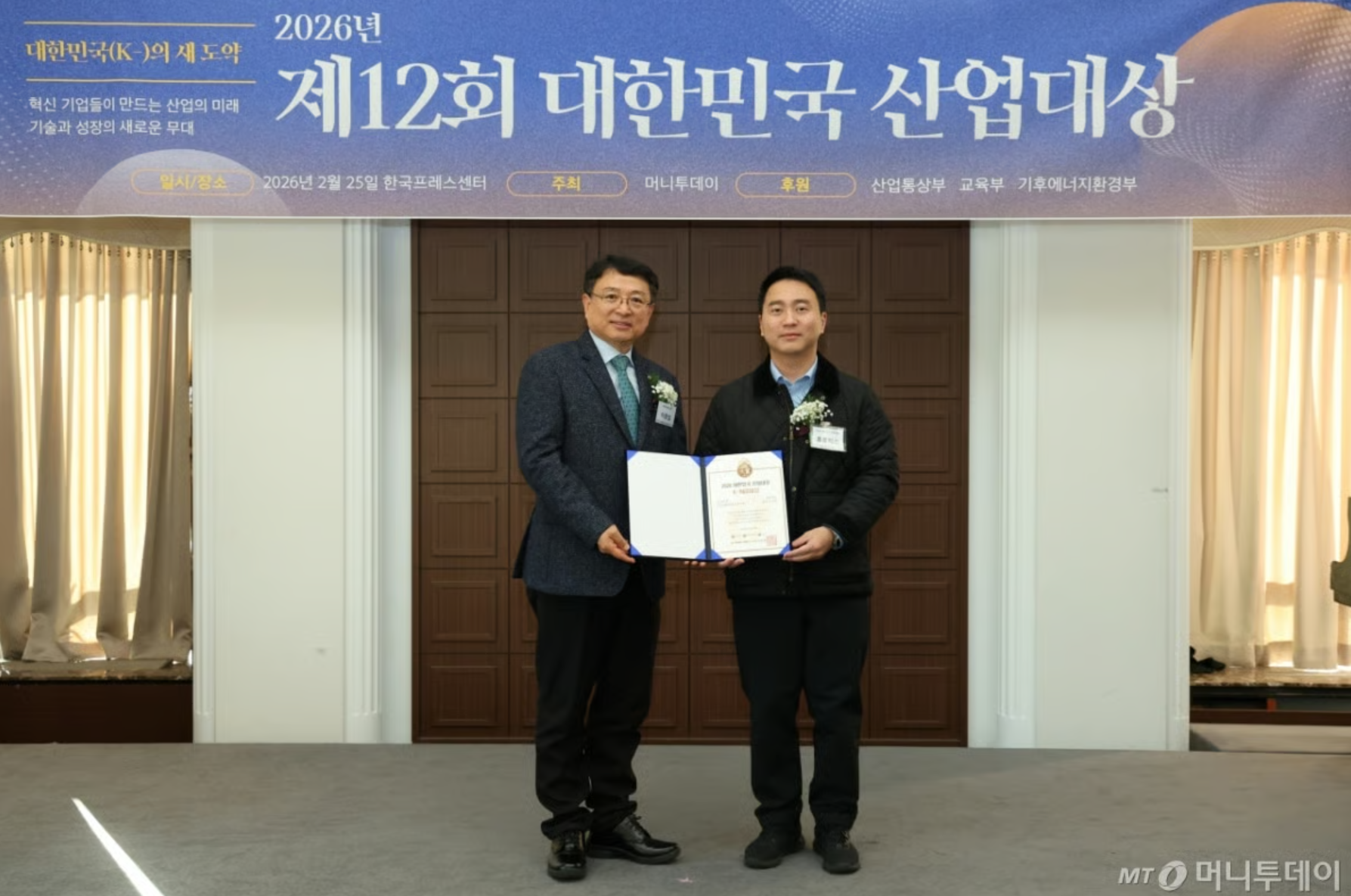 이기욱 휴로틱스 대표(사진 오른쪽)가 25일 오후 서울 중구 한국프레스센터에서 열린 머니투데이 주최의 '2026 제12회 대한민국 산업대상' 시상식에서 4년 연속상으로 '소프트 웨어러블 로봇' 부문 'K-R&D대상'을 수상하고 이종섭 동국대학교 교수와 기념사진을 촬영 중이다.