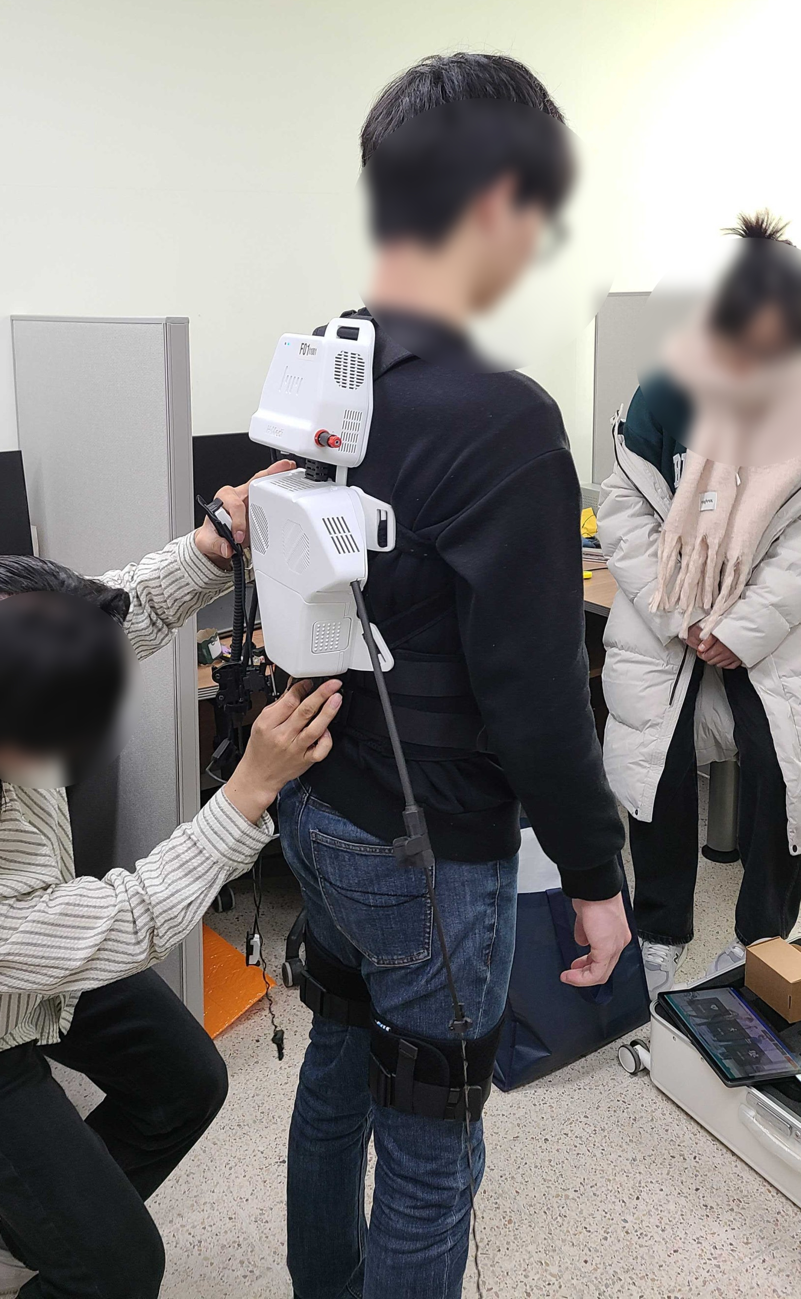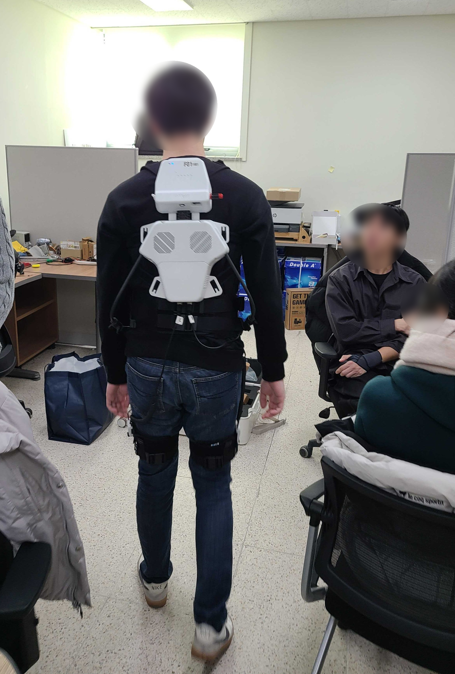 연구원분들이 직접 H-Medi를 착용해 보고, 케이블-텐던 원리로 다리를 들어 올리는 보조 힘을 느끼자 여기저기서 “오!” 하는 탄성이 터져 나왔습니다. 그도 그럴 것이, 기존 웨어러블 로봇은 굉장히 벌키하고 모터로 직접 힘을 가하는 방식이다 보니 ‘아주 강력해 보이는’ 느낌이 강한 반면, 저희 H-Medi는 겉으로 보면 그냥 케이블만 달려 있는 옷이거든요. 경량급으로 보이는 H-Medi의 힘을 직접 느껴보시면, 다들 비슷한 반응을 보이시곤 합니다. (케이블-텐던의 당기는 힘은 220 N, 약 20 kg을 들어 올릴 수 있는 힘입니다!)