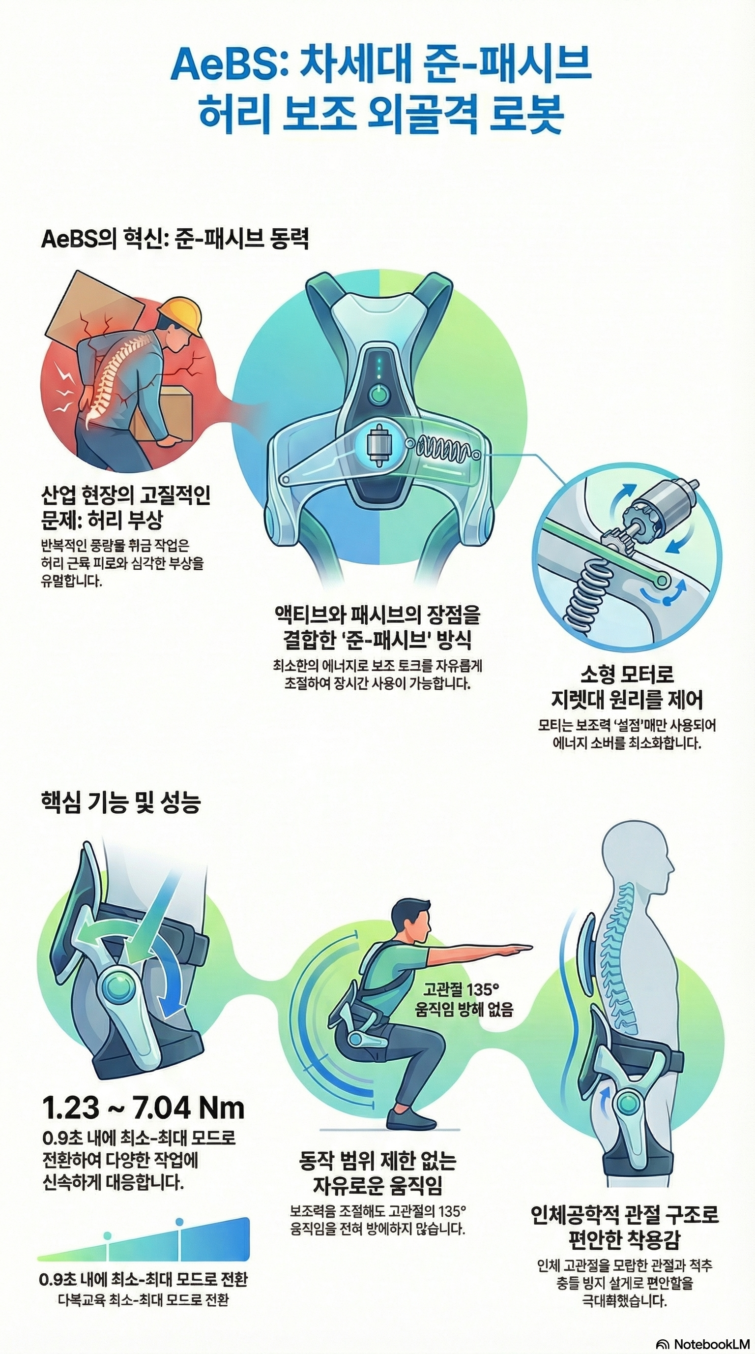 이 연구는 작업자의 허리 부상 방지를 위해 가변 보조 토크를 제공하는 준수동형 허리 보조 외골격 'AeBS'를 제안합니다. AeBS는 소형 가변 중력 보상 모듈(CVGC-II)을 적용하여 착용자의 동작 범위(RoM)를 제한하지 않으면서 상황에 맞는 보조 토크를 조절할 수 있습니다. 특히 토크 크기를 변경할 때만 1W의 전력을 소모하므로 에너지 효율이 높고, 인체 고관절을 모방한 기구학적 설계를 통해 착용자의 자유로운 움직임을 보장합니다. 실험 결과 135도의 고관절 굴곡 범위에서 최대 7.04Nm의 가변 토크를 제공함을 확인했으며, 사용자 설문을 통해 착용감과 실용성을 검증했습니다